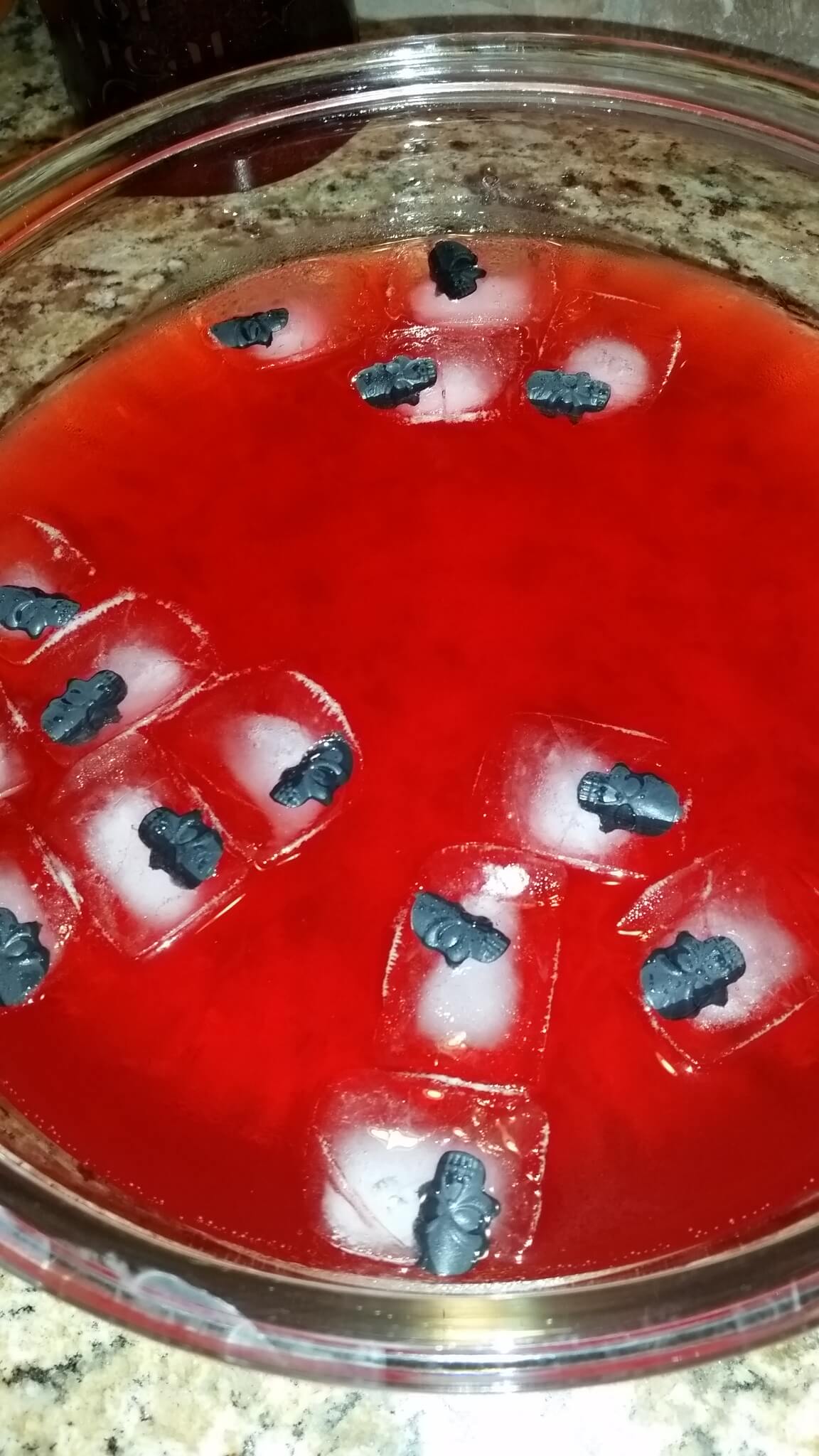 I mixed 3 cups of red Hawaiian Punch with 6 cups of Sprite. The night before I washed the skeleton rings and froze them in ice cube trays. Simple! The kids thought it was “so cool”.